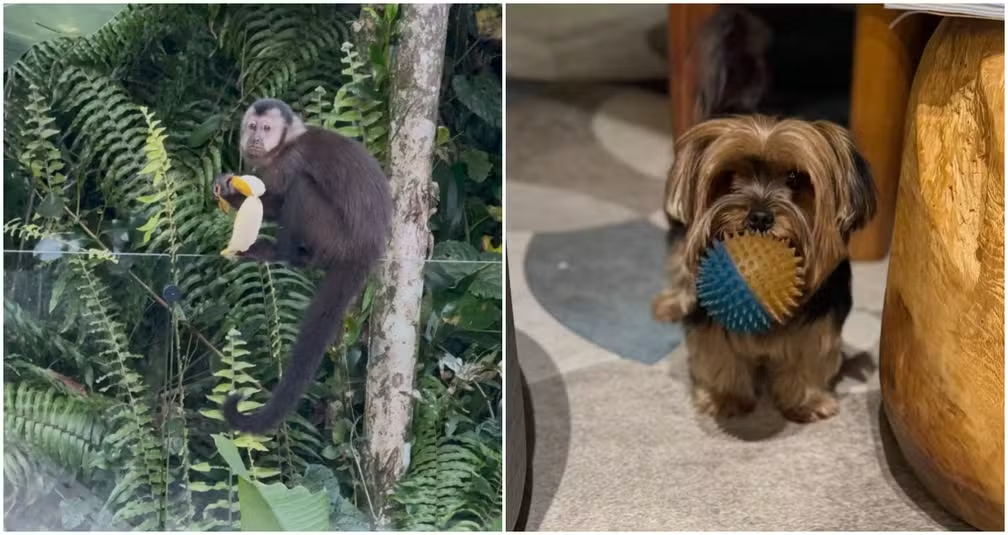 A porta de vidro da sala estava aberta, o que facilitou a entrada do macaquinho. Ele percorreu o ambiente com tranquilidade e foi direto até uma bancada onde havia um cacho de bananas. Porém, no momento em que se preparava para sair com seu “prêmio”, o pequeno ladrão foi surpreendido pela cachorrinha da casa, chamada Skye — nome inspirado na personagem da animação infantil Patrulha Canina.