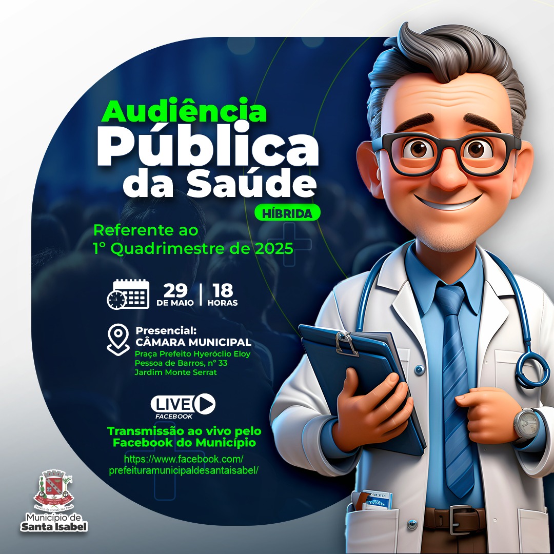 A Prefeitura de Santa Isabel convida todos os moradores a participarem da Audiência Pública da Saúde, que será realizada na quarta-feira, 29 de maio, às 18h, em formato híbrido — com opção presencial e transmissão ao vivo pela internet.