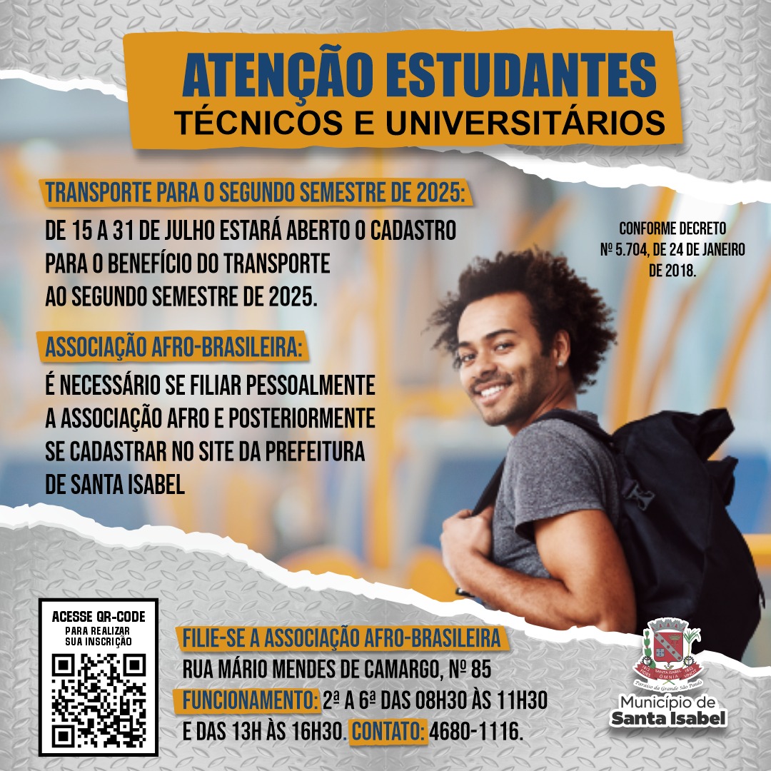 Após a filiação, os estudantes devem finalizar o cadastro pelo site oficial da Prefeitura de Santa Isabel. Um QR Code para acesso direto à plataforma de inscrição está disponível na arte de divulgação da campanha.