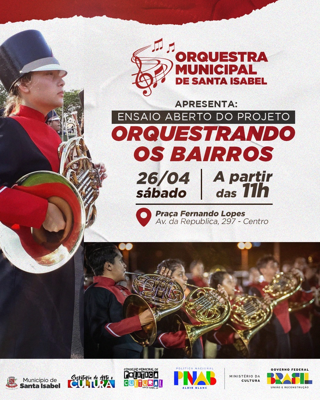 Santa Isabel será palco de uma manhã cultural neste sábado, dia 26 de abril, com o Ensaio Aberto do projeto “Orquestrando os Bairros”, promovido pela Orquestra Municipal de Santa Isabel.